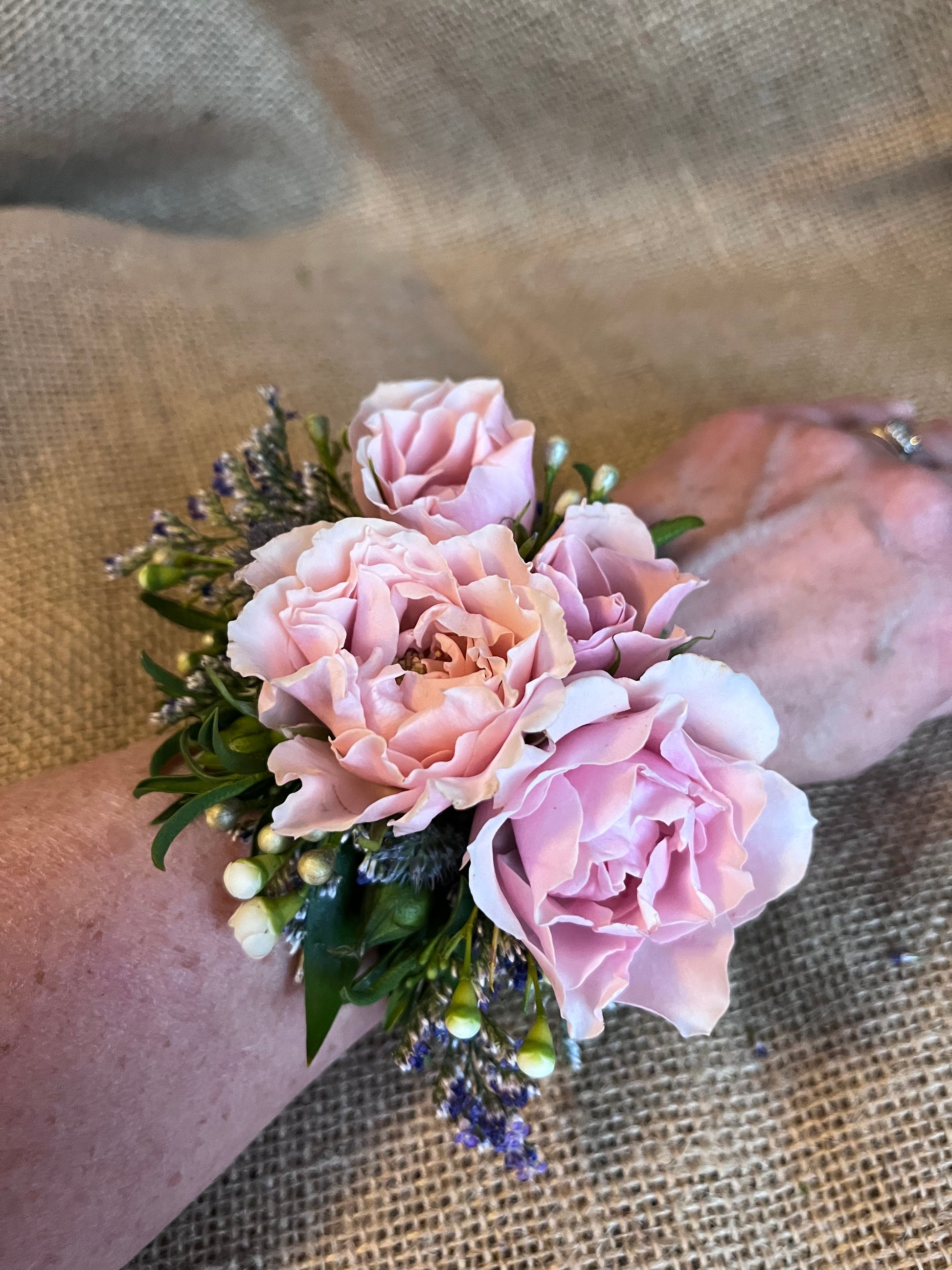 A modern take on the wrist corsage, these miniature floral gardens are built on a metal cuff bracelet base. Petite florals, greens and accents are carefully selected for coordination with your color palette, then artfully applied to the cuff. They are like a piece of floral jewelry!