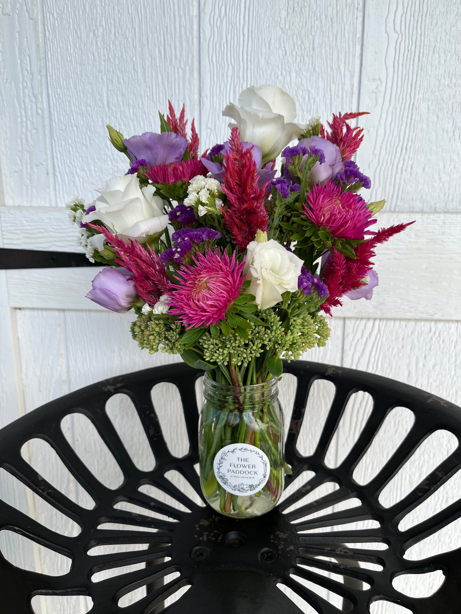 A beautiful assortment of focal and filler flowers, thoughtfully arranged with a variety of greens, in a custom TFP jar. This is the perfect size for a hostess gift, Thank You, a friend's birthday. . .or, "just because!" These arrangements are a favorite of our Flower Paddock customers!